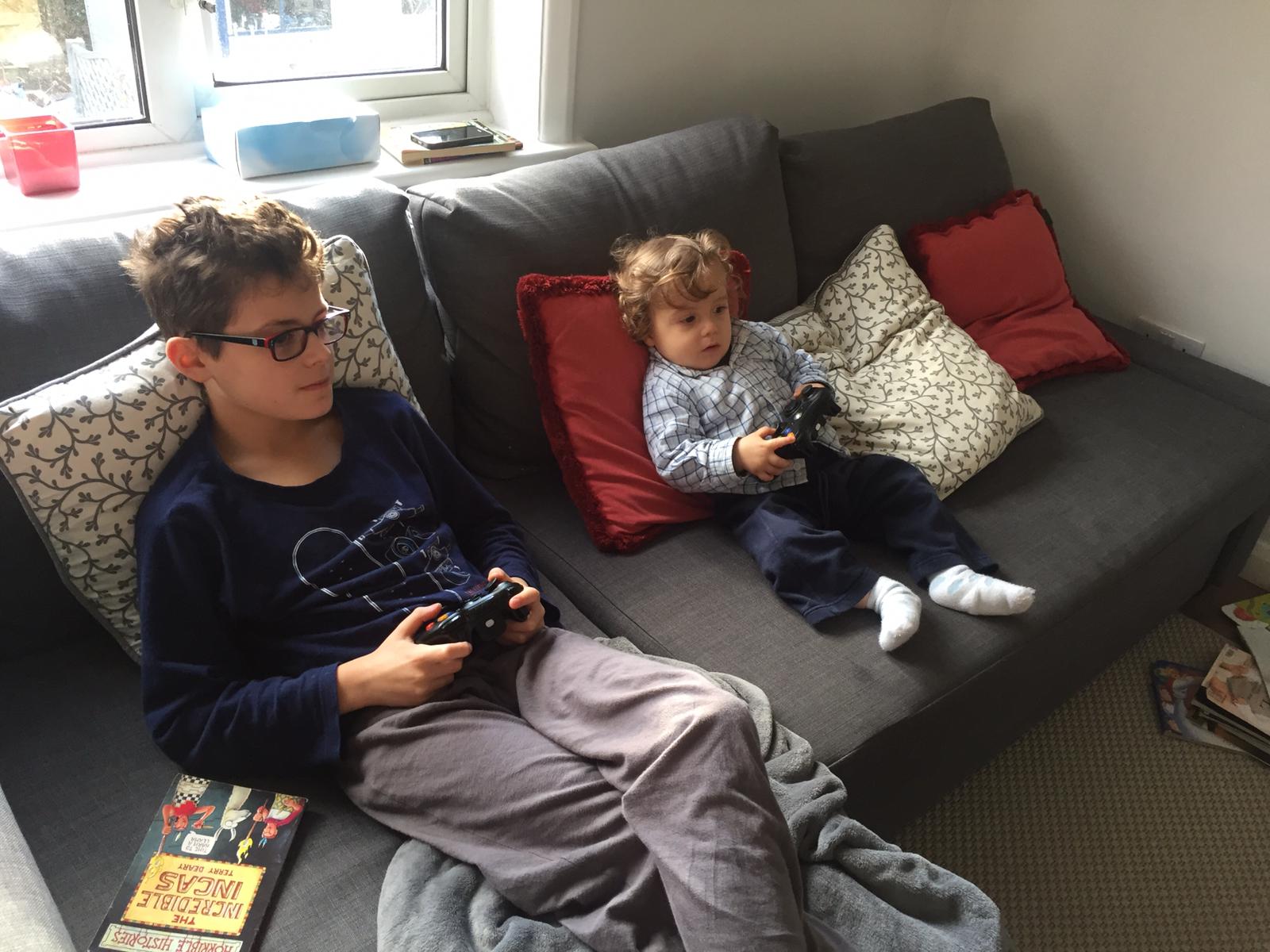 Há uns tempos, entrei na sala e deparei-me com esta imagem. Os dois manos no sofá a jogar na consola! “Qu’é isto?!?!” Claro que o Leo estava apenas a imitar o que via o mano fazer, mas fazia-o com tal concentração, que deu tempo para ir buscar o telemóvel e tirar uma foto e ele nunca mudou de posição. Há alturas em que quero registar alguns momentos para a posteridade e não dá tempo, pois o senhor Lekinhas não pára um segundo. Desta vez desconfio que, mesmo que eu tivesse demorado três quartos de hora, ainda ia encontrar o rapazola assim, sentadinho, olhos no ecrã, a jogar consola com o seu Big Brother, todo regalado.